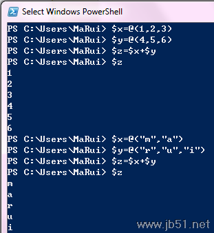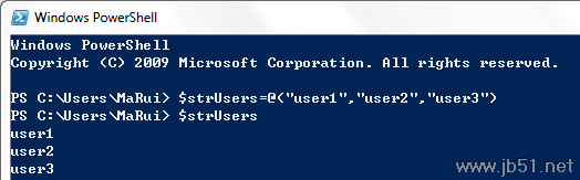 在PowerShell中,声明一个变量为数组时,需要使用符号"@",例如:
