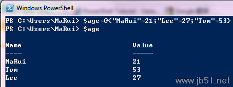$age=@{} <enter> "MaRui"=21;"Lee"=27;"Tom"=53