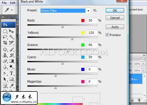 使用自动对比.然后选择:图像>调整>黑与白>绿色过滤器