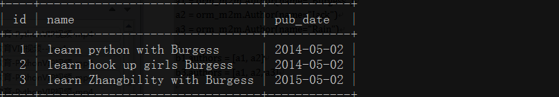 __author__ = "Burgess Zheng" import orm_m2m from sqlalchemy.orm import sessionmaker #增删改查需要创建会话(光标) #这里需要导入sessionmaker:from sqlalchemy.orm import sessionmaker(写在首) Session_class = sessionmaker(bind=orm_m2m.engine) # 创建与数据库的会话session class ,>注意,这里返回给session的是个class,不是实例 Session = Session_class() # 生成session实例 #cursor #增加数据 b1 = orm_m2m.Book(name="learn python with Burgess",pub_date="2014-05-2") b2 = orm_m2m.Book(name="learn Zhangbility with Burgess",pub_date="2015-05-2") b3 = orm_m2m.Book(name="learn hook up girls Burgess",pub_date="2014-05-2") a1 = orm_m2m.Author(name="Burgess") a2 = orm_m2m.Author(name="Jack") a3 = orm_m2m.Author(name="Rain") b1.authors = [a1, a2] b3.authors = [a1, a2, a3] Session.add_all([b1, b2, b3,a1, a2, a3]) Session.commit()[root@python burgess_test]# py orm_m2m_api.py