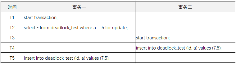 接着执行如下两个事务的SQL,在执行到T5时间时发生死锁: