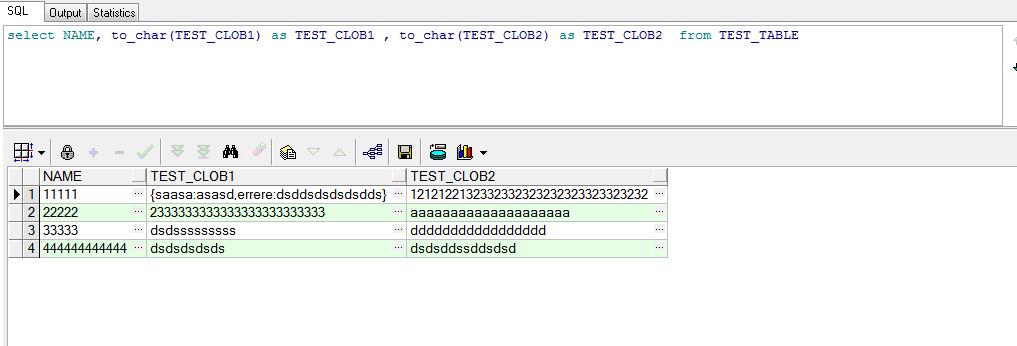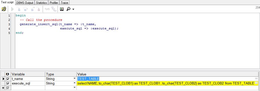 create or replace procedure generate_insert_sql(t_name in varchar2,execute_sql out varchar2) as CURSOR col_cur is select column_name, data_type from user_tab_cols where table_name like t_name; col_name varchar2(500); BEGIN FOR col in col_cur loop if col.data_type='CLOB' then col_name := ' to_char(' || col.column_name || ') as '||col.column_name||' ,'; else col_name := col.column_name || ','; end if; execute_sql := execute_sql || col_name; end loop; execute_sql := 'select ' ||RTRIM(execute_sql,',')|| ' from '||t_name; end;