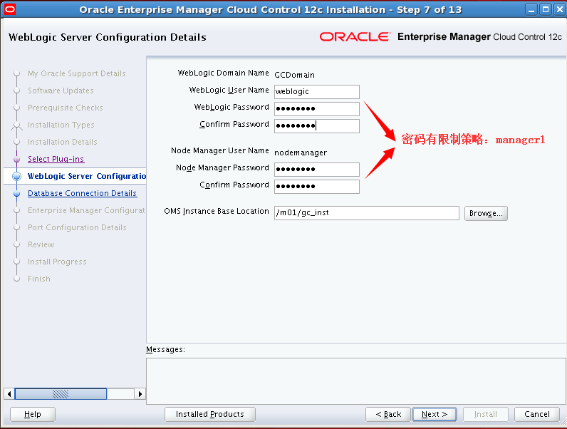 6.配置Weblogic Server,填入Weblogic和Node Manager密码及OMS instance Base Location: