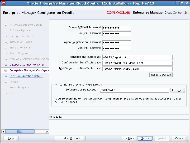 8.输入 sysman用户和Agent注册使用的密码, 安装程序会自动为你提供EM所需创建表空间数据文件的位置: