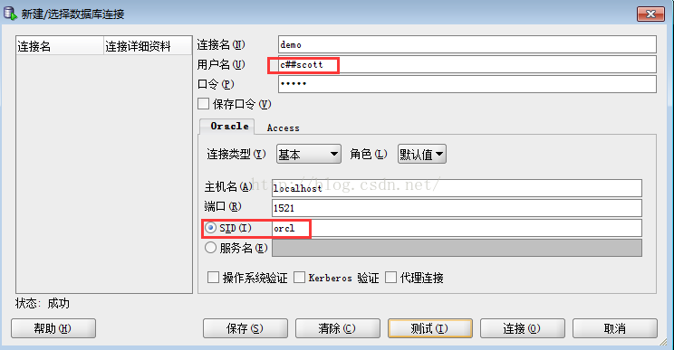 使用SQL Developer创建连接,并使用c##scott用户登录