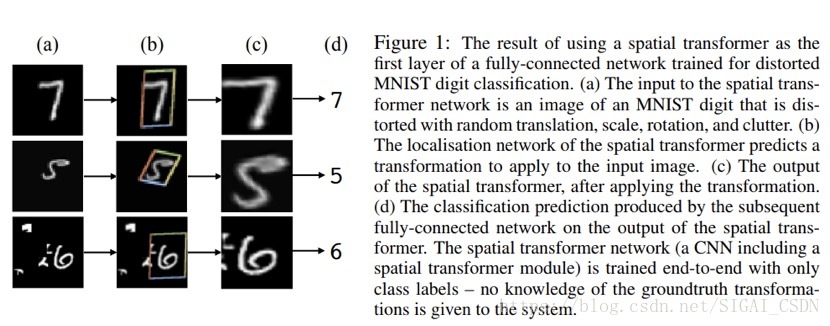 (4) 网络除了可以利用STN输出的Feature map外,同样可以将变换参数作为后面网络的输入,由于其中包含着变换的方式和尺度,因而可以从中得到原本特征的某些姿势或角度信息等。
