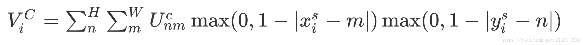 经过以上的两步操作后,输出的Feature map上每一个像素点都会通过空间变换对应到输入Feature map的某个像素位置,但是由于feature score对于feature position的偏导数无法计算,因而我们需要构造一