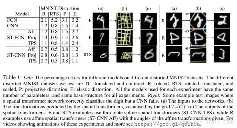 原始数据集选择Mnist, 分别进行了旋转(R)、旋转、缩放、平移(RTS),透射变换(P), 弹性变形(E)四种方式对数据集进行了预处理,选用FCN和CNN作为baseline,分别使用仿射变换(Aff )、透射变换(Proj )、以及薄板样条变换(TPS )的空间变换方式进行STN模块的构造,我们可以看出STN-based网络具有全面优于baseline的错误率。右图为部分输入数据经过STN变换后的结果。可以看出STN可以学习到多种原始数据的位置偏差并进行调整。