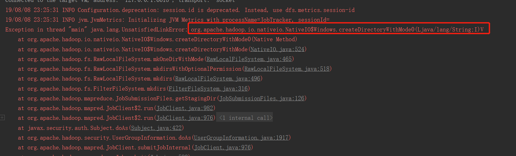 Exception in thread "main" java.lang.UnsatisfiedLinkError: org.apache.hadoop.io.nativeio.NativeIO$Windows.createDirectoryWithMode0(Ljava/lang/String;I)V