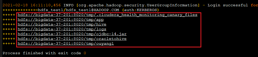 2021-02-18 15:33:50,189 INFO [org.apache.hadoop.security.UserGroupInformation] - Login successful for user hdfs_test1/hdfs_test1@HADOOP.COM using keytab file hdfs-conf-kerberoshdfs_test1.keytab