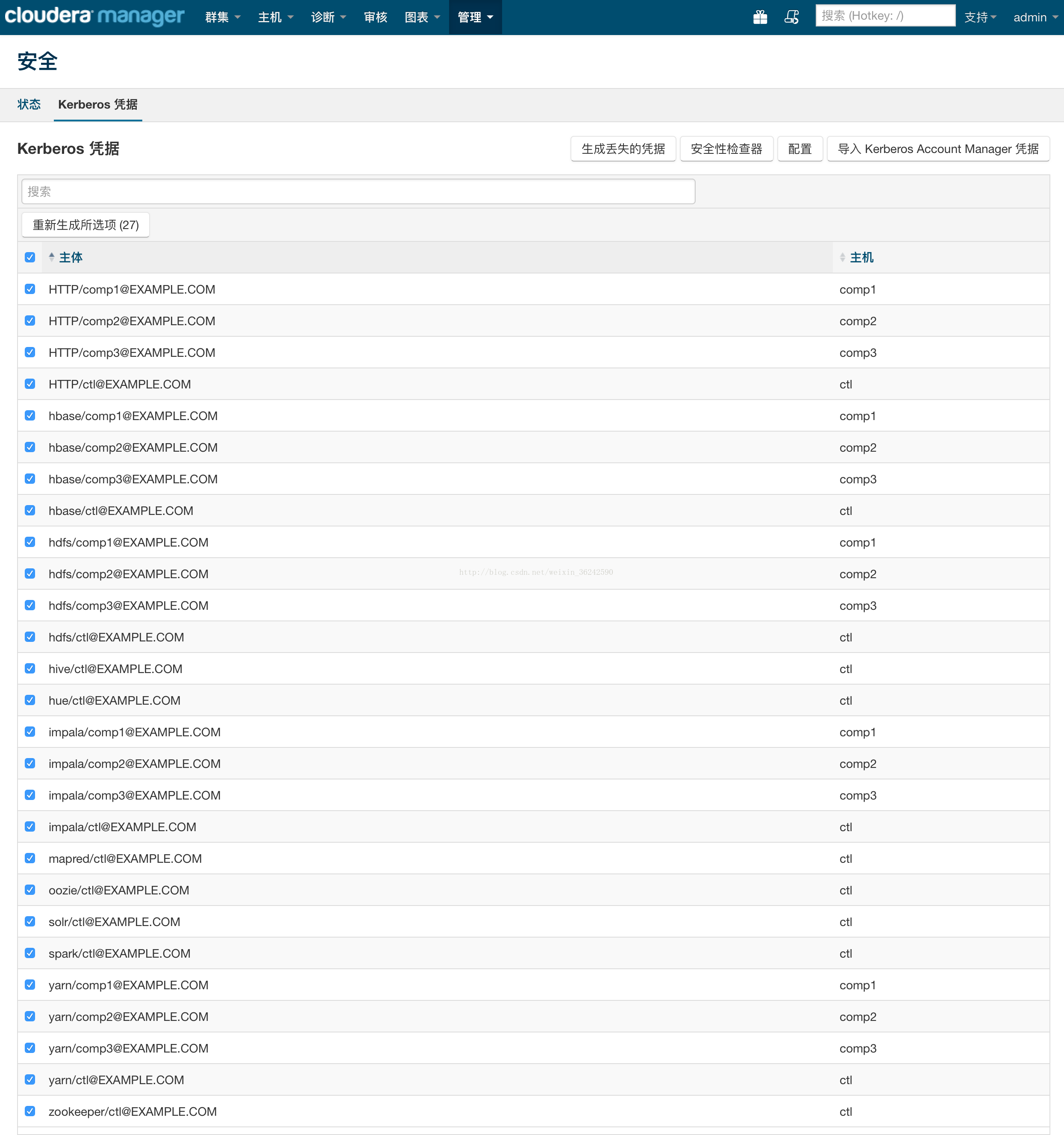 CDH集群卸载干净,然后进入右上角的管理->安全->kerberos凭据->勾选全部主体->重新生成所选项