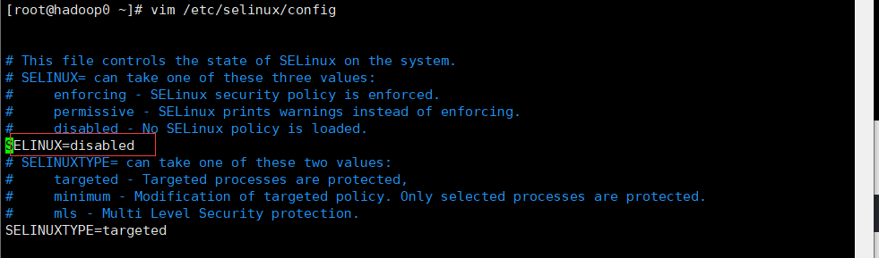 为了保证selinux永久关闭,需要修改配置,使用 vim /etc/selinux/config.修改为如下结果