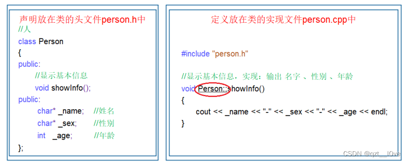 2. 声明放在.h文件中,类的定义放在.cpp文件中。