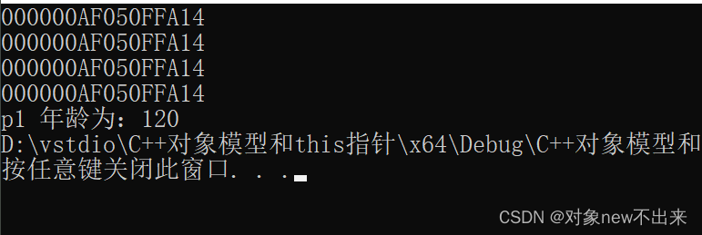为什么结果和空对象一样呢,因为我开头就说了,C++中成员变量和成员函数是分开存储的,无论是怎样的成员函数都不会占用类对象的内存空间。