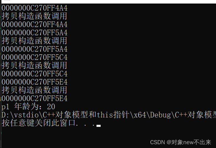 //p1.PersonAddAge(p2).PersonAddAge(p2);//链式调用,返回不加&结果都是20,调用拷贝构造;