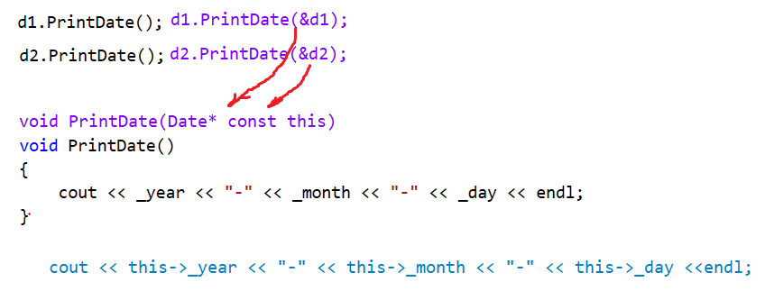 - 但是在成员函数内部,我们可以显式的使用this(有需要)