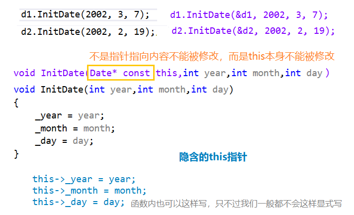 Date类中有InitDate与PrintDate两个成员函数,函数体中没有关于不同对象的区分,那当s1调用InitDate函数时,该函数是如何知道应该设置d1对象,而不是设置d2对象呢?