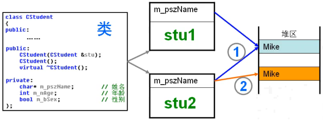 这个问题怎么解决呢?显然拷贝构造函数不能简单的拷贝该资源,需要手动编写拷贝构造函数,不能使用默认的拷贝构造函数。需要在拷贝资源的时候将资源复制一份,这样两个对象就会指向不同的资源。这就是浅拷贝和深拷贝的区别