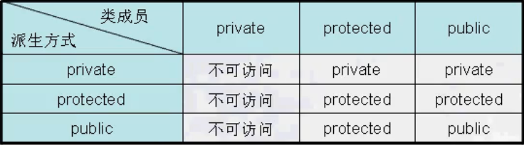 既然类中的成员具有不同的访问权限,而类继承也有不同的继承方式(一般类继承分为公有继承、保护继承、私有继承),那么类继承之后,也应该具有不同的访问权限,不同的派生情况与类成员的访问权限如下: