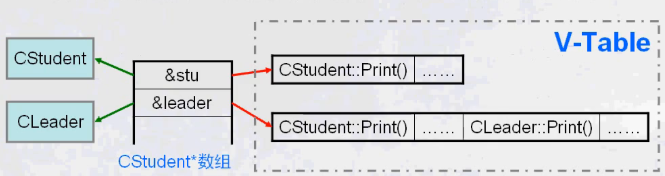 1. 编译器将虚函数表的指针存放在对象实例开头,通过对象的地址即可得到这张虚函数表,遍历其函数指针可调用相应的函数