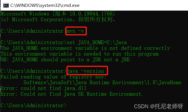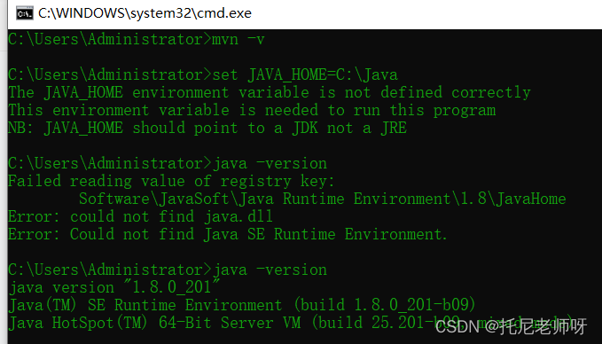 然后mvn -v了一下,尴尬了,java -version更尴尬了
