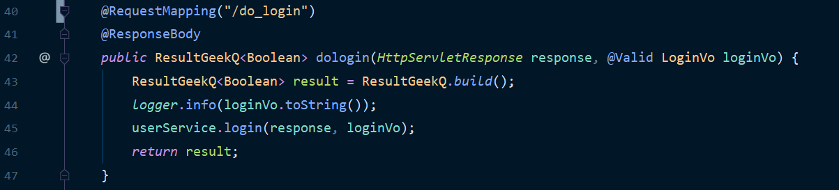 src/main/java/com/geekq/miaosha/controller/LoginController.java捕获到了登录请求,然后进行处理,接下来就是一行一行的谈一谈这几句话