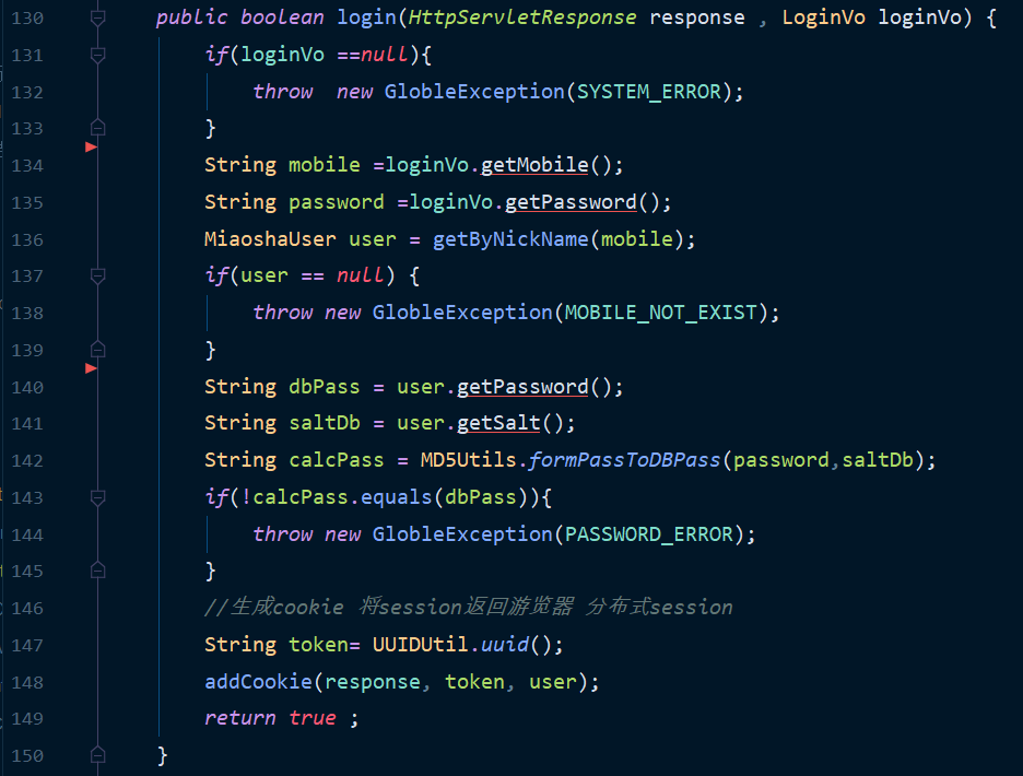 | 136-145 | 由电话号码获取用户,redis没有就直接查数据库,如果没有电话或者密码不对就抛出异常 |