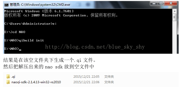 输入qibuild init,结果是在空文件夹下生成一个.qi文件。然后把解压出来的nao sdk放到空文件中。