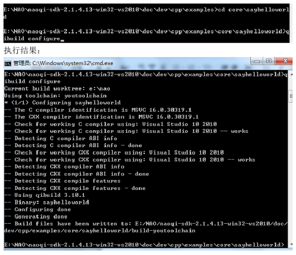 到达nao sdk中的例子sayhellworld文件夹下,执行qibuild configure,接着执行qibuild make,