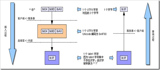 – 插入数据将经过utf8=>utf8=>latin1的字符集转换,若原始数据中含有/u0000~/u00ff范围以外的Unicode字符,会因为无法在latin1字符集中表示而被转换为“?”(0x3F)符号,以后查询时不管连接字符集设置如何都无法恢复其内容了。