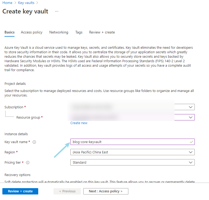 创建一个全新的key vault服务,选择自己的订阅和资源组,设置下名称: