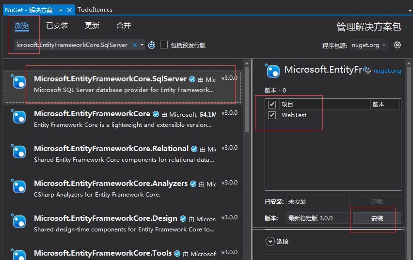 连续步骤 添加:Microsoft.EntityFrameworkCore.SqlServer