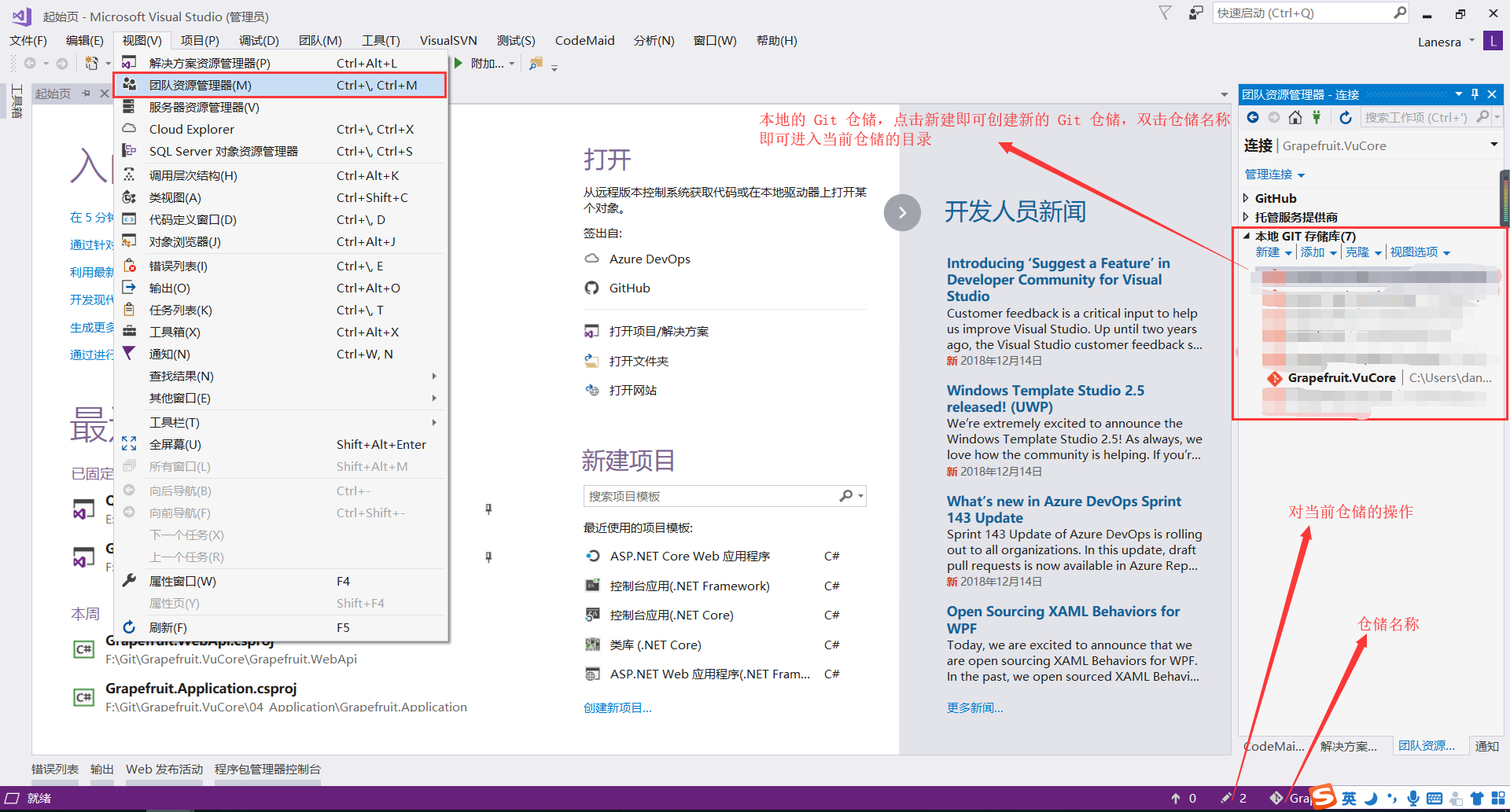 当然,你也可以使用 VS 进行创建 Git 仓储,使用 VS 创建仓储后会自动帮我们创建 .gitignore 和 .gitattributes 文件,同样的,后续对于该仓储的任何 Git 操作,我们也可以通过 VS 进行。