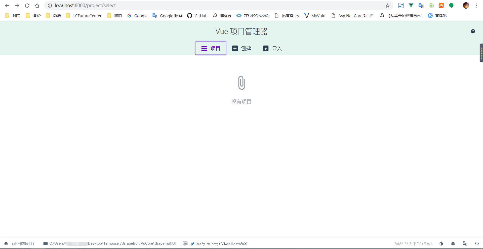 在整个的开发过程中,后端应用使用 Visual Studio 2017 进行开发,对于前端项目,则是使用 Visual Studio Code 进行开发,嗯,使用专业的工具做相应的事。对于前端的 Vue 项目,我采用的是 Vue CLI 来进行构建的,当然,巨硬也为我们准备了一套 Vue 的模板,如何使用的方法可以在附录中进行查看。