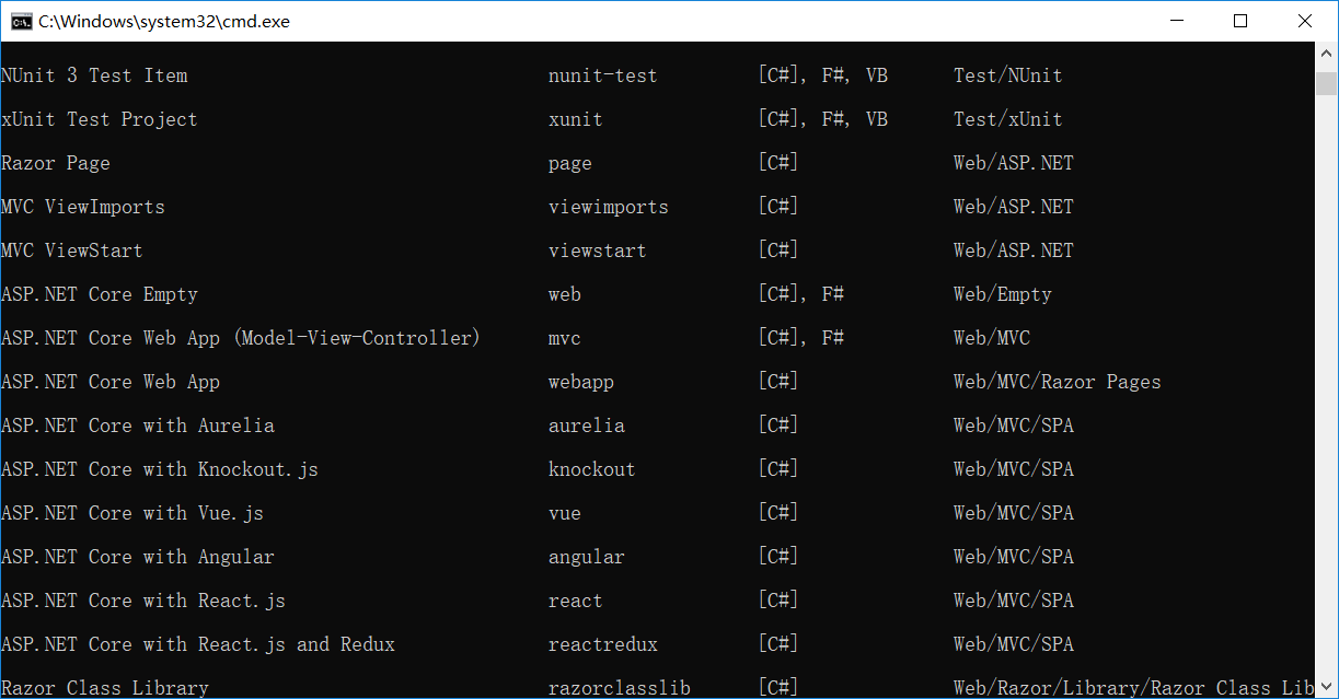 微软官方有提供一套 Vue 的 SPA 应用模板,不过并没有显示在我们使用 VS 创建项目的页面中,而且需要我们添加一个插件之后,使用 .NET Core CLI 的方式创建。因为自己并没有详细了解这块的内容,这里只列出创建的方法,详细的介绍请查看微软的官方文档(Building Single Page Applications on ASP.NET Core with JavaScriptServices )。