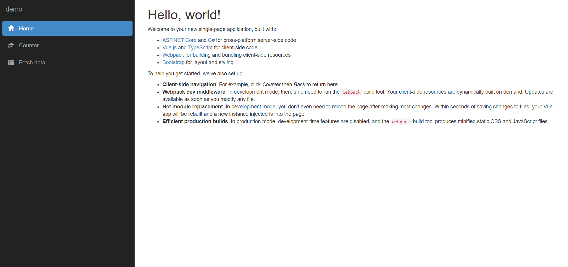当你安装好模板之后,可以看到,多了使用 Aurelia、Vue、Knockout 创建 SPA 模板的选项,这时我们就可以使用 dotnet new 命令来创建包含 Vue 的模板应用。模板创建完成后需要安装依赖的包。加载完依赖的包之后,我们就可以通过 VS 或 VS Code 开发调试我们的项目。