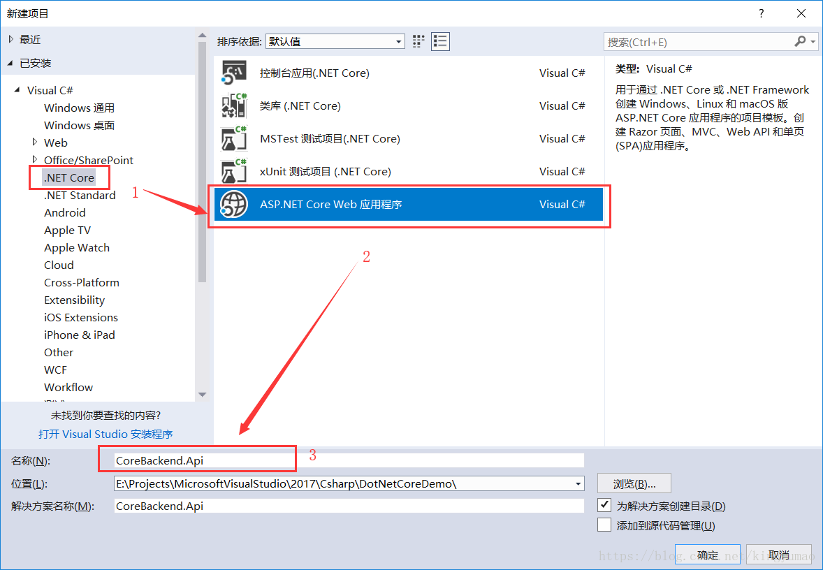 2.新建一个名称为CoreBackend.Api的【.NET Core】的【ASP.NET Core Web 应用程序】