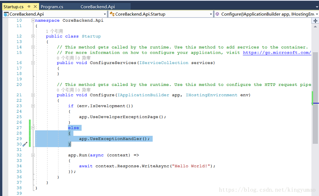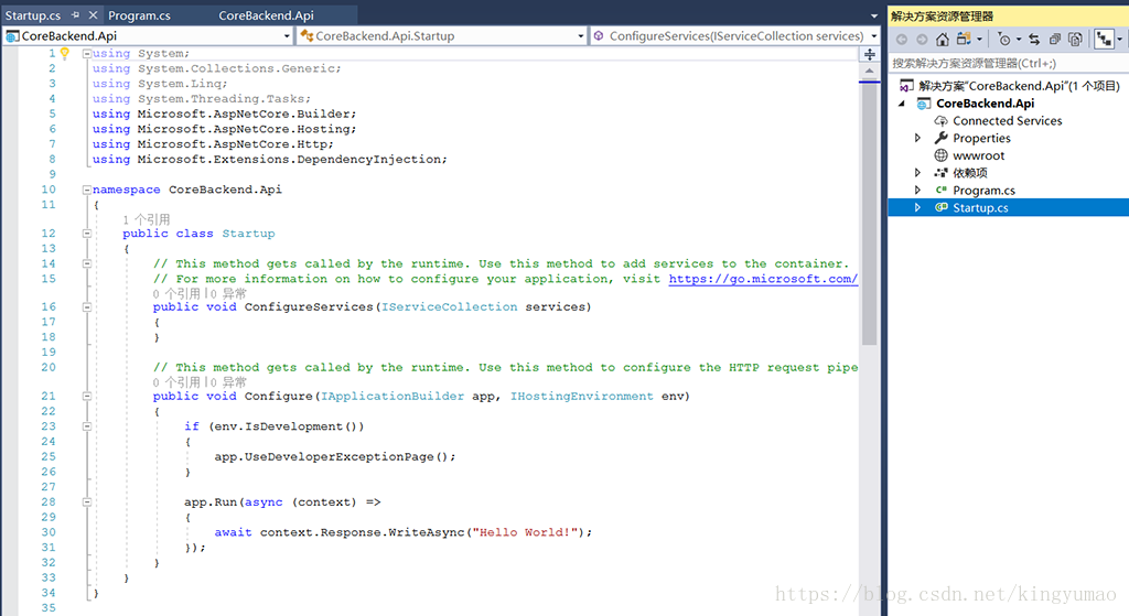 Configure方法是asp.net core程序用来具体指定如何处理每个http请求的, 例如我们可以让这个程序知道我使用mvc来处理http请求, 那就调用app.UseMvc()这个方法就行. 但是目前, 所有的http请求都会导致返回"Hello World!".