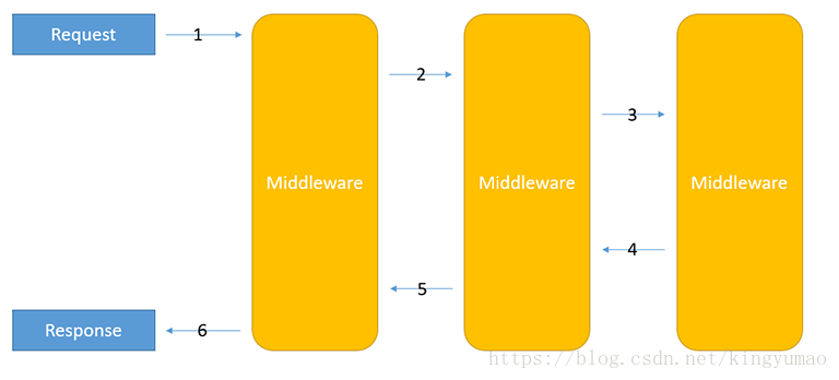 每层中间件接到请求后都可以直接返回或者调用下一个中间件. 一个比较好的例子就是: 在第一层调用authentication验证中间件, 如果验证失败, 那么直接返回一个表示请求未授权的response.