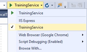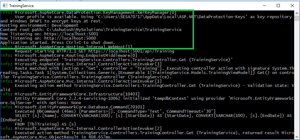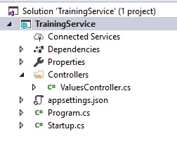 6、接下来,您可以使用内部服务/帮助器概念在服务请求数据时读取/验证数据。我已经创建了使用数据库上下文管理数据的ITrainingServices接口和相应的服务类TrainingServices。使用这种方法,您还可以创建一个独立于db上下文的本地服务(LocalTrainingServices),并将值保留在内存中进行测试。如果在这种情况下尚未建立实体框架,则可以在startup.cs中将本地服务作为Scope。用以下代码替换startup.cs中的AddScoped<>行: