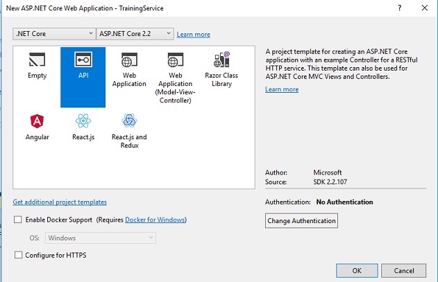 2、使用默认示例valuecontroller(以后可以删除)选择用于创建REST API的API 。您可以取消选中“为HTTPS配置”复选框,因为这将创建基于SSL的项目,并且您必须在URL中使用HTTPS而不是HTTP(这是可选步骤)。