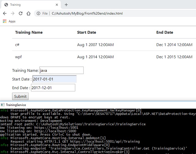 在我的完整课程中,我将创建一个培训服务作为示例,以演示Web服务,实体框架和一些前端概念。前端将提供一个UI,以使用REST API的表格形式列出所有培训细节,而另一个表格则以名称,开始日期,结束日期和“确认”按钮作为输入字段。确认后,REST API应将新的培训详细信息保存到数据库中。