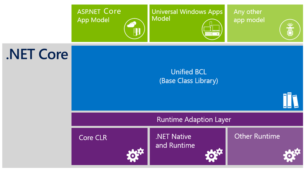 应用层: .NET Core的系统构成,最上层是应用层,是开发基于UI应用的框架集,包括了ASP.NET Core(用于创建web app),和 UWP(用于创建Windows10 app)。