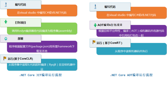 如果使用JIT编译器部署程序时只需要将程序打包为IL的assemblies,在方法第一次执行前编译器将IL编译为目标机机器码(Native code),而AOT编译会在编译时将源代码直接编译为目标机机器码。