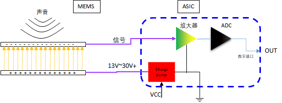 下图是数字麦克风的结构图,相比模拟麦克风,数字麦克风在输出前增加了一个ADC,前置的结构采集声压输出电压。