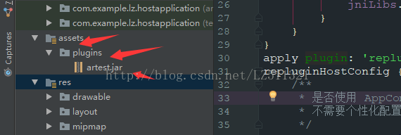 dependencies { compile fileTree(dir: 'libs', include: ['*.jar']) compile 'com.qihoo360.replugin:replugin-plugin-lib:2.2.1' }接着BuildApk,并且将生成的apk修改为插件名称+jar格式的jar包,这样的话,插件式apk这边的事情就都做完了,