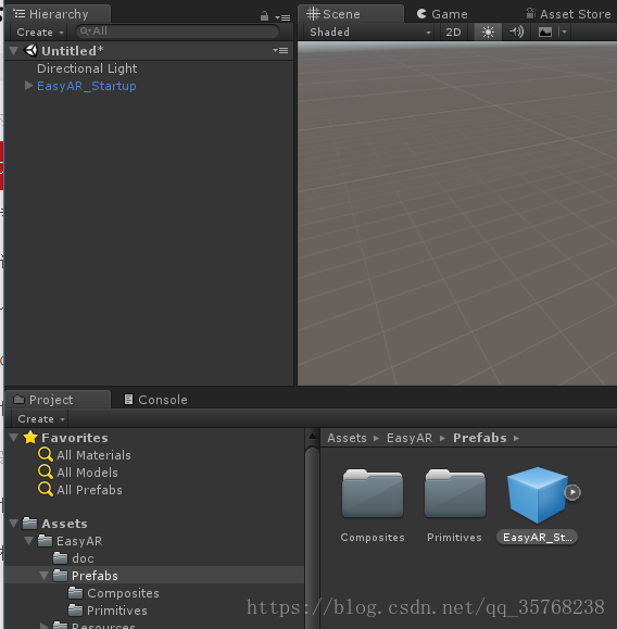 5、单机Project中的EasyAR->Prefabs->Primitives,找到蓝色立方体(ImageTarget),将其拖入到Hierarchy;