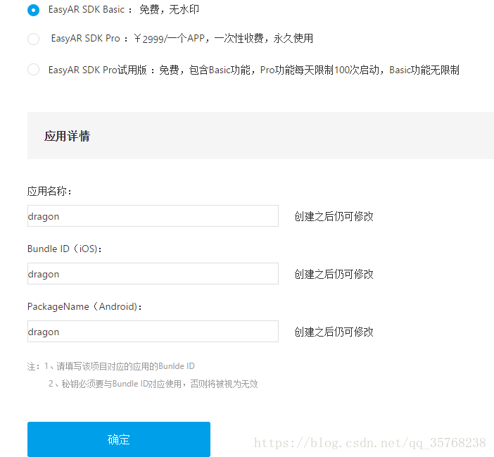 4、在Easy官网注册一个账号,登陆后点击添加SDK,按下图步骤即可,添加完成点开将SDK License Key的内容复制到EasyAR_StartUp的Key处。