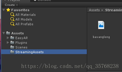 6、在Project中创建一个名为StreamingAssets的文件夹,将图片(最好是jpg的)拖入其中,且将同样的图片也拖一张到Assets下如下图: