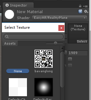 7、在Assets空出右击鼠标,选择Create->Material,会出现一个球,然后单机那个球,在Inspector中按下图那样设置,在小框中单机Select,选择你刚才放在Assets下的那个图片,图片就将附着在球上。